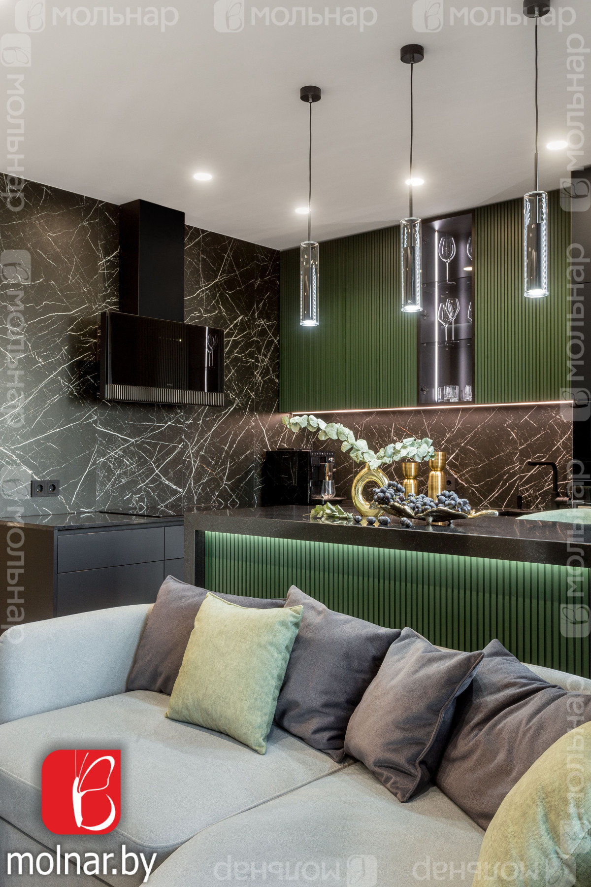 Кухня-гостиная: просторная и светлая, объединенная с уютной зоной отдыха — идеальное место для теплых встреч и семейных вечеров.