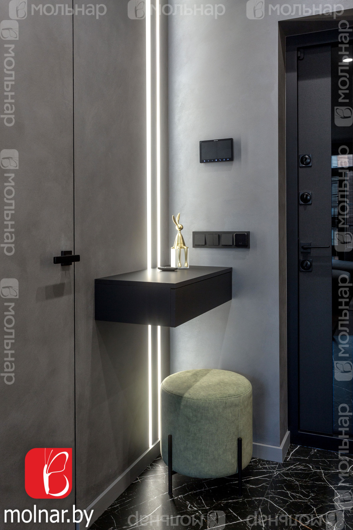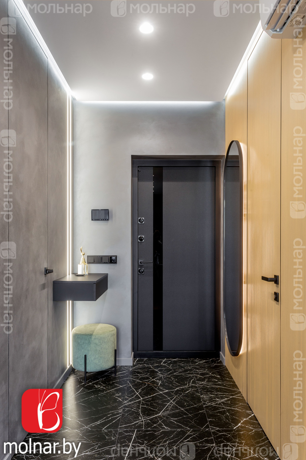 Коридор: выполнен в стиле минимализм, с продуманной системой хранения, визуально расширяет пространство.