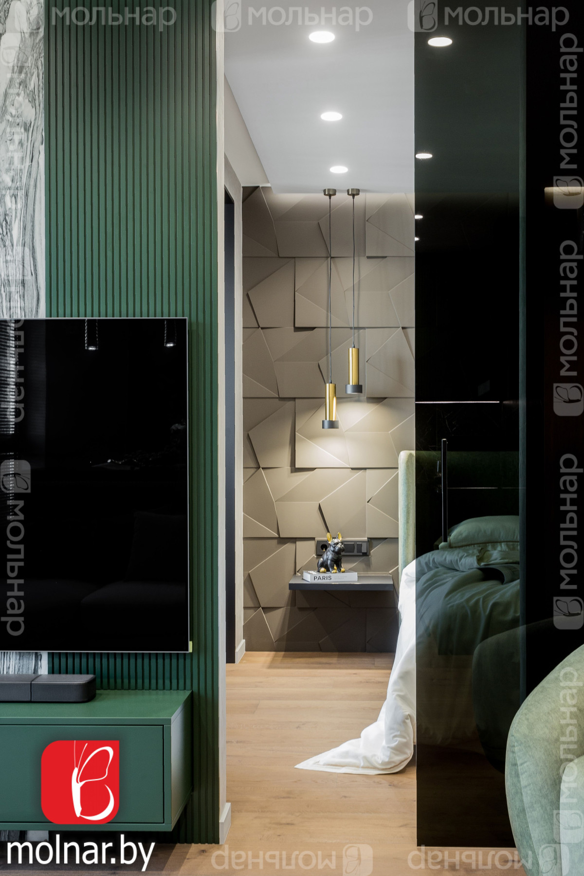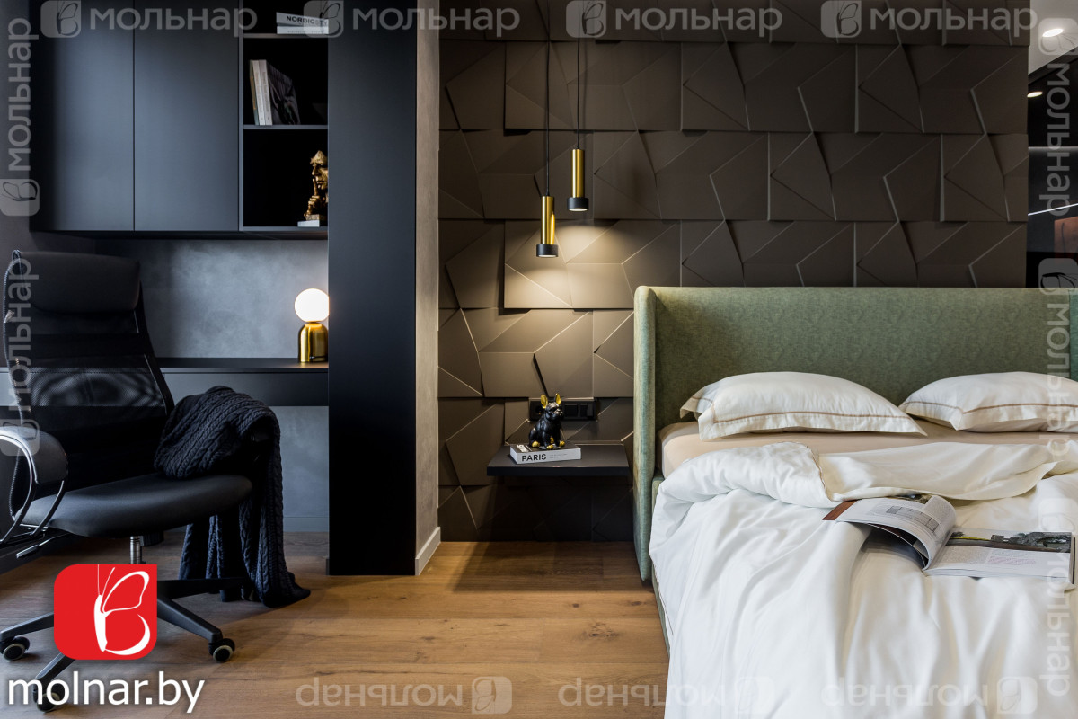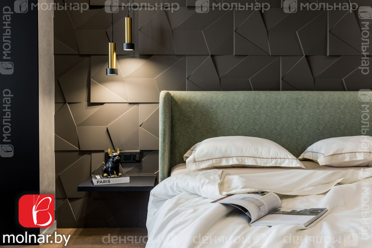Спальня: стены украшены гипсовыми панелями.