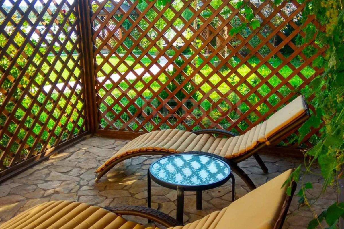 Велика зона відпочинку з бесідками та садовими шезлонгами.