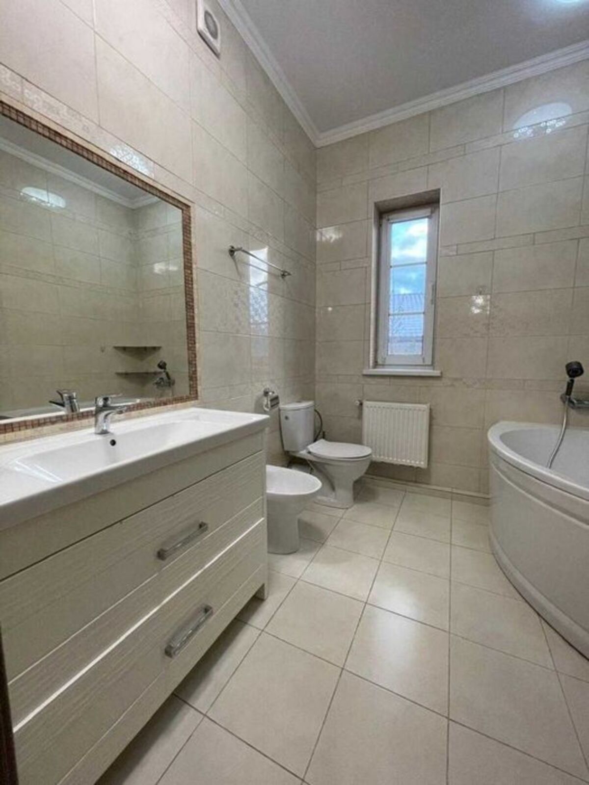 - 1-й поверх будинку обладнаний просторою кухнею-вітальнею із виходом на терасу , окремою кімнатою , а також просторий санвузол з душевою кабіною, зона прання (пральна + сушильна машина).