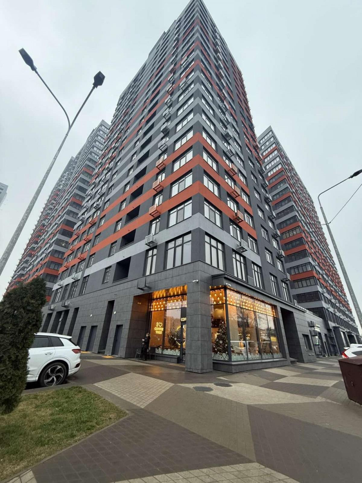 Є підземний паркінг. На закритій території дитячий та спортивний майданчик, є кавярня, магазин.