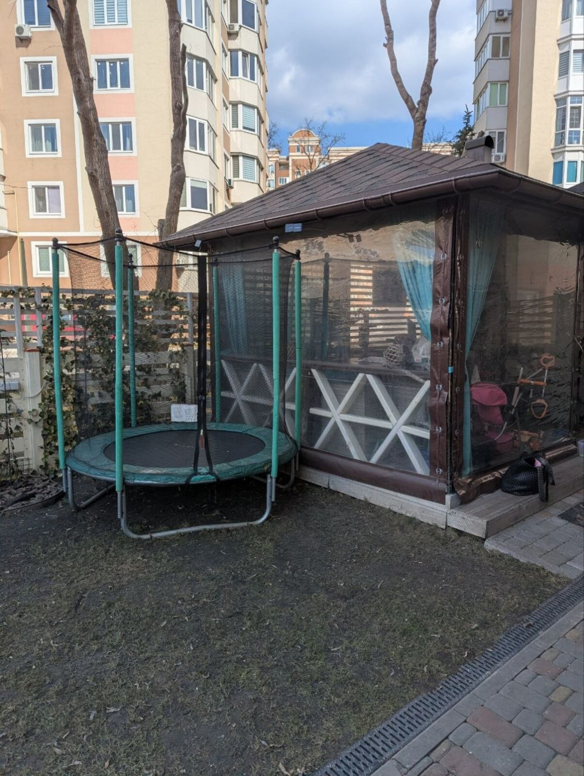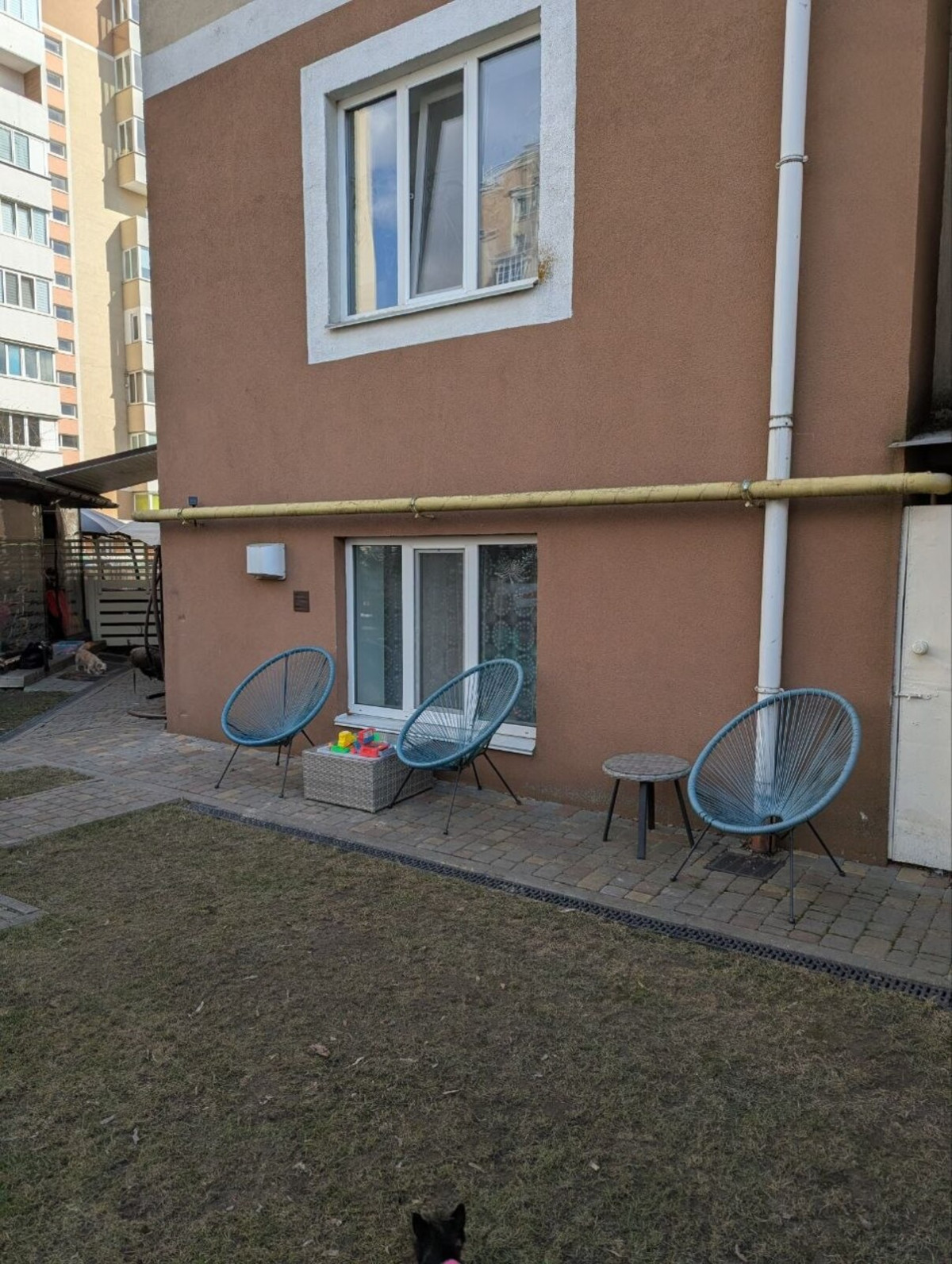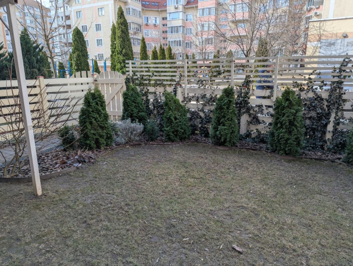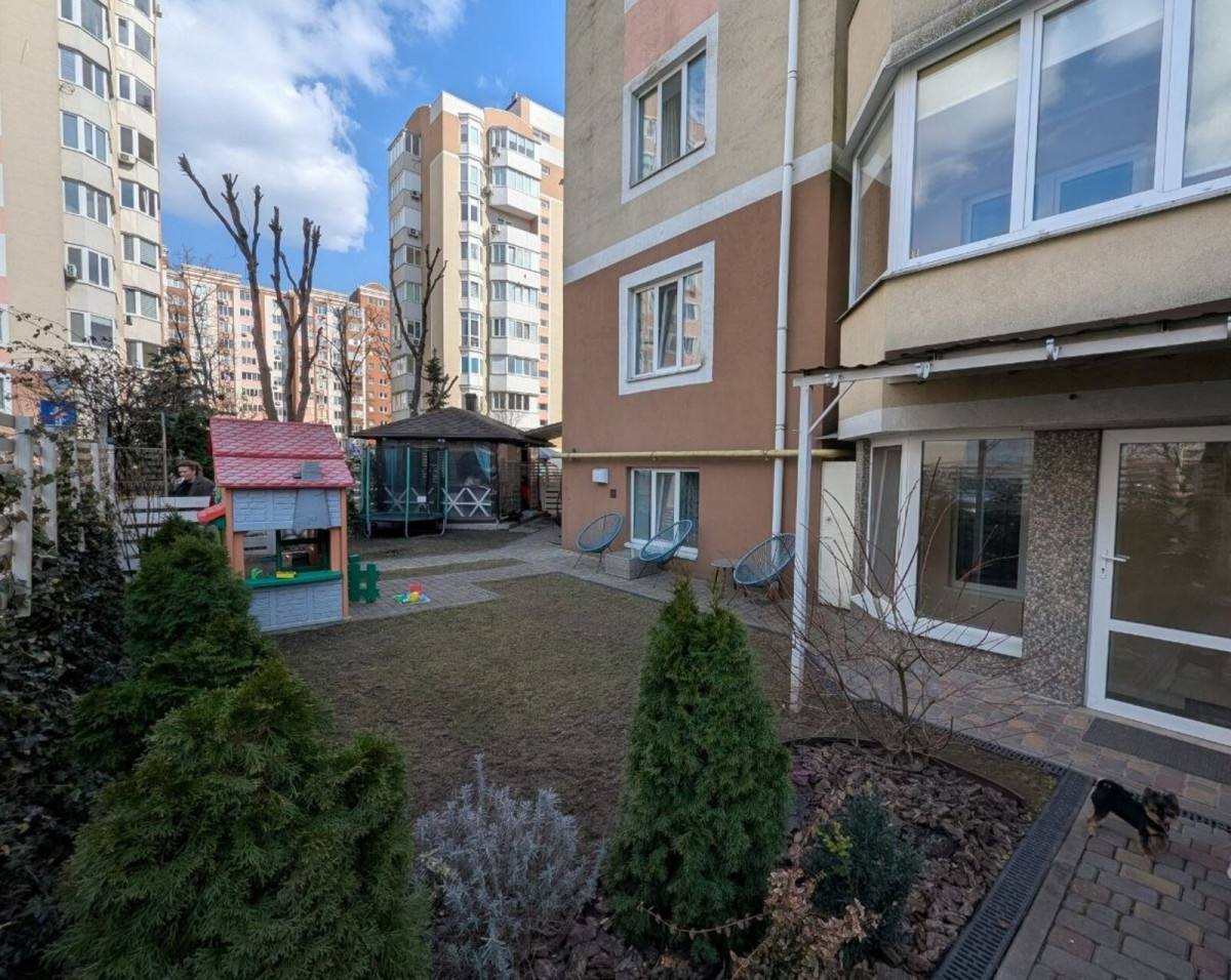 2 виходи: в підїзд та свій окремий вихід у дворик, де є бесідка і завжди можна відпочити від робочого дня, випити кави з ранку за столиком серед квітів та кущів, погратися з дитиною (є дитячий домик) та вигуляти собачку.