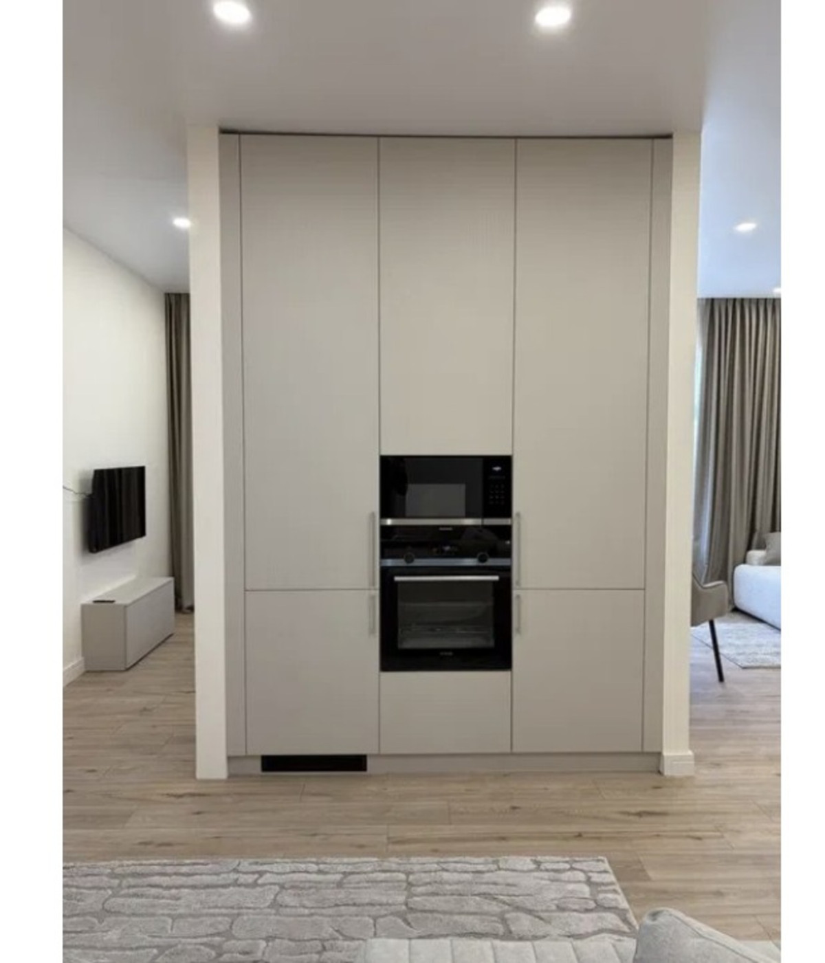 Столешня та робоча зона з натурального каменю, корпусні меблі з італійського матеріалу Cleaf, німецька фурнітура Jung, німецька вологостійка підлога Classen, сантехніка теж німецькі бренди Grohe та Geberit, вся кухонна техніка Siemens(духовка, мікрохвильова, посудомийка, індукція), холодильник Libher, 2 телевізори Samsung, хозблок Bosch(пральна, сушильна, бойлер).