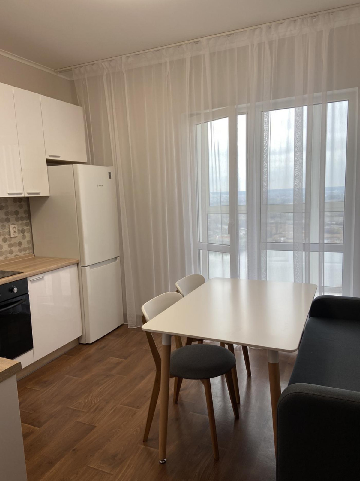 В квартире есть вся необходимая новая техника (холодильник, кондиционер, стиральная машина, духовка, телевизор и тд) и мебель. Красивый вид из окна.
