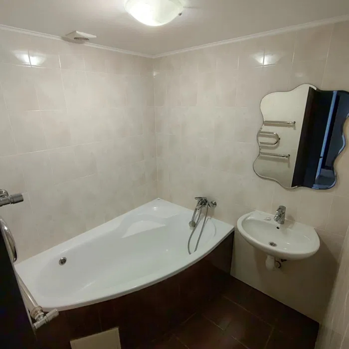 Підлога всієї квартири окрім житлових кімнат виконана з кахелю .