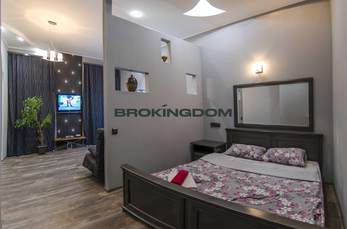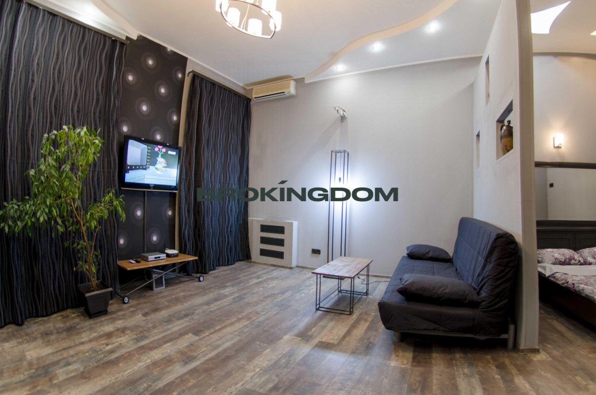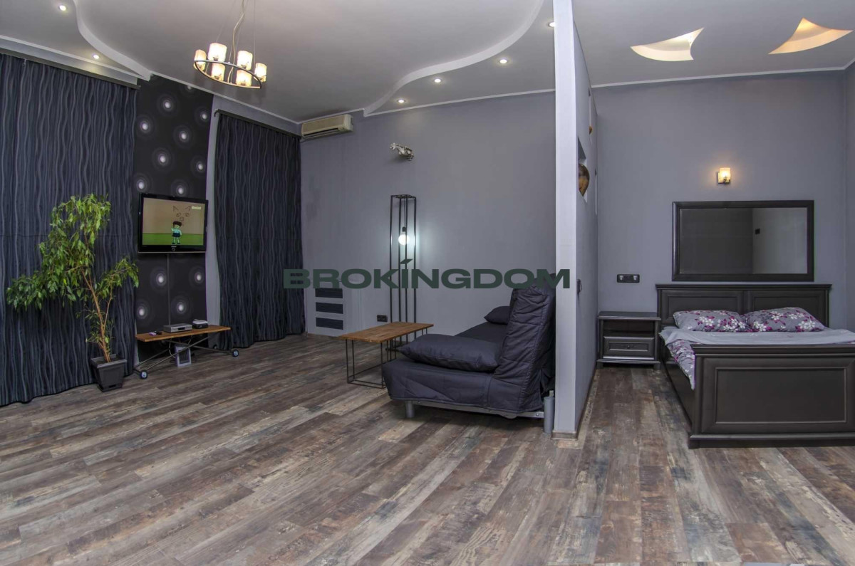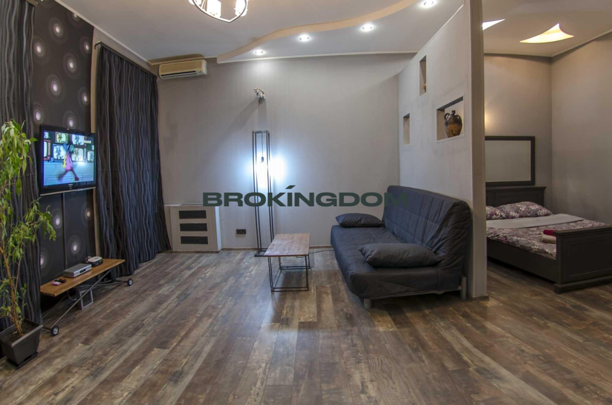 Квартира простора, з високими стелями. Раніше квартира була двокімнатною, тепер перепланована у студію зі спальнею, відокремлене перегородкою, з двоспальним ліжком, та зоною відпочинку з диваном. Кухня окрема. Великий LCD телевізор із кабельними каналами, WI-FI інтернет. Кухня мебльована та обладнана всією необхідною технікою. Газова плита. Простора ванна кімната з великою кутовою ванною.