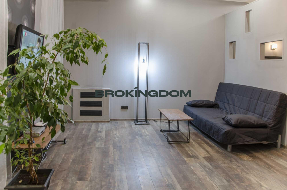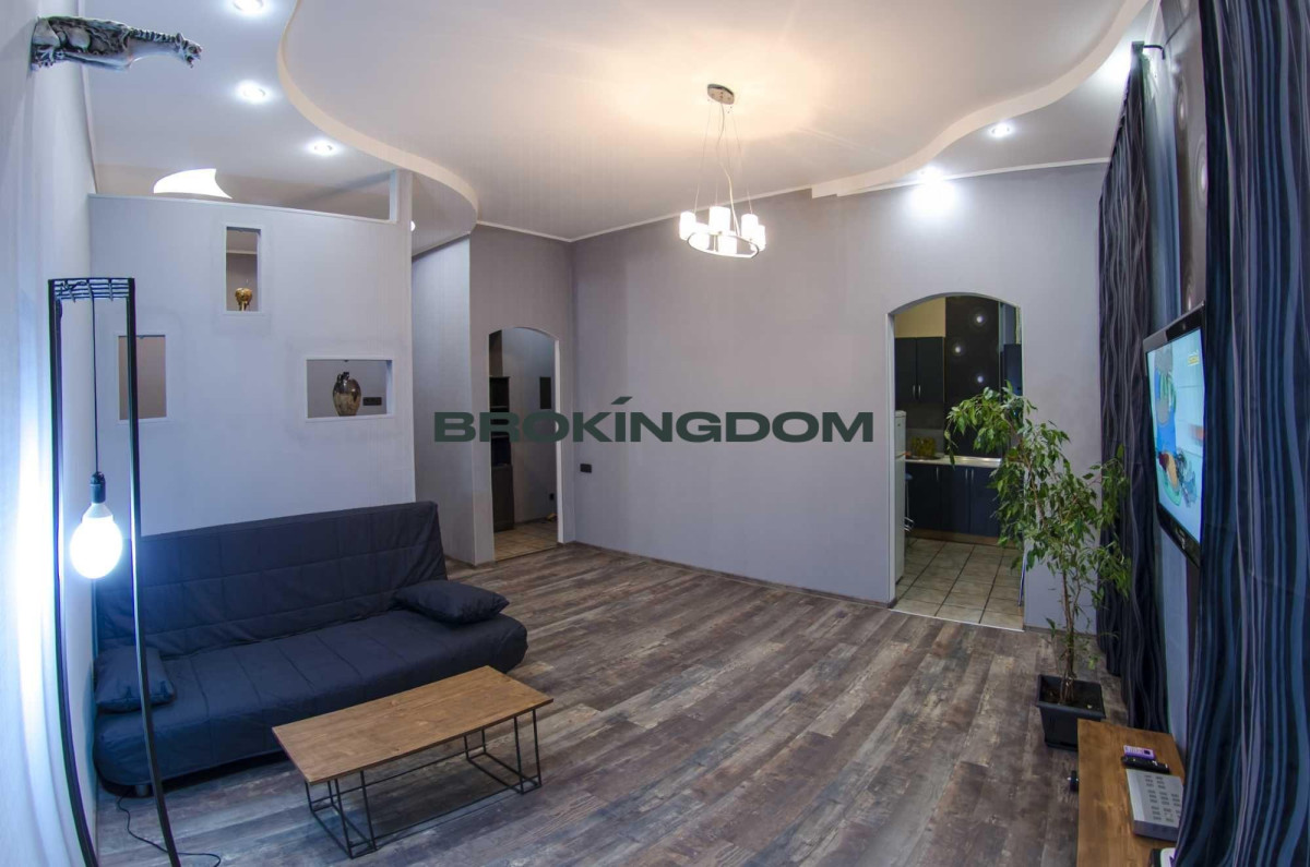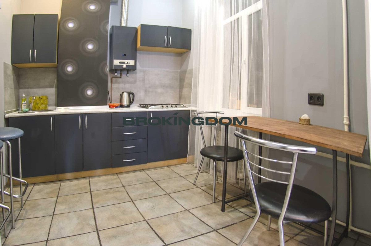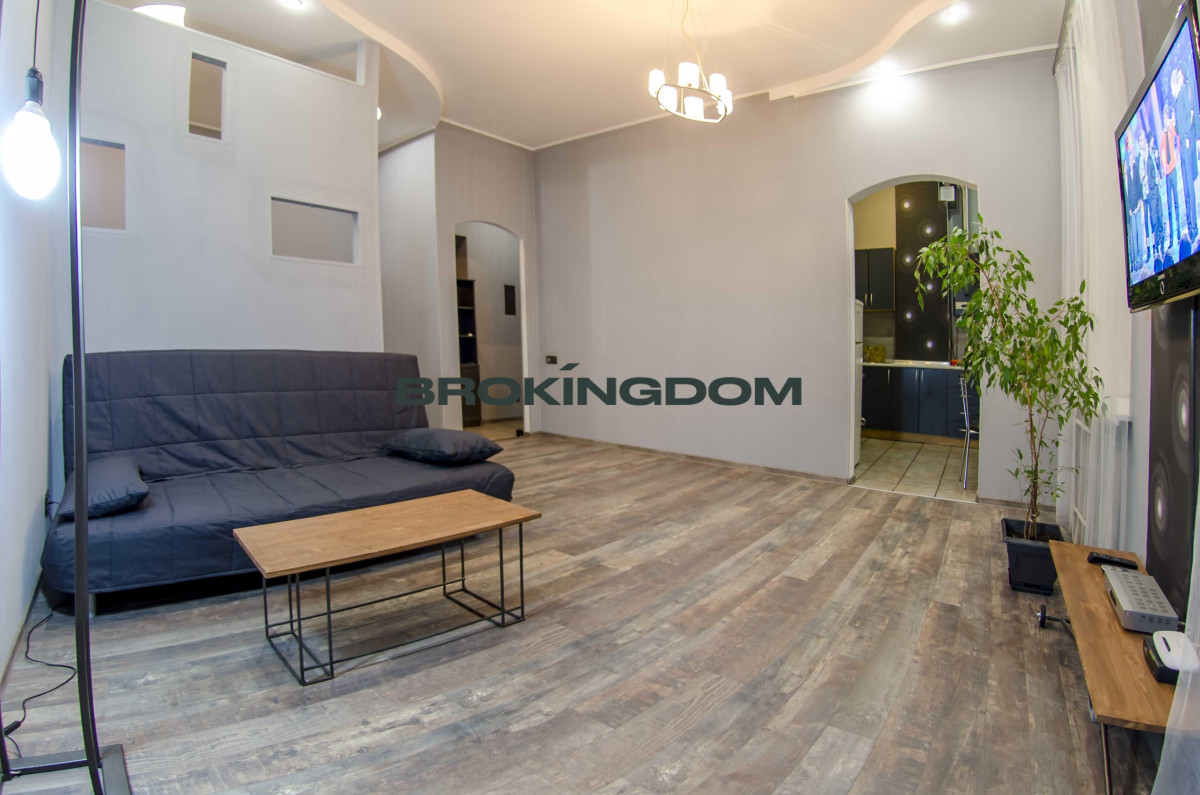 Квартира простора, з високими стелями. Раніше квартира була двокімнатною, тепер перепланована у студію зі спальнею, відокремлене перегородкою, з двоспальним ліжком, та зоною відпочинку з диваном. Кухня окрема. Великий LCD телевізор із кабельними каналами, WI-FI інтернет. Кухня мебльована та обладнана всією необхідною технікою. Газова плита. Простора ванна кімната з великою кутовою ванною.