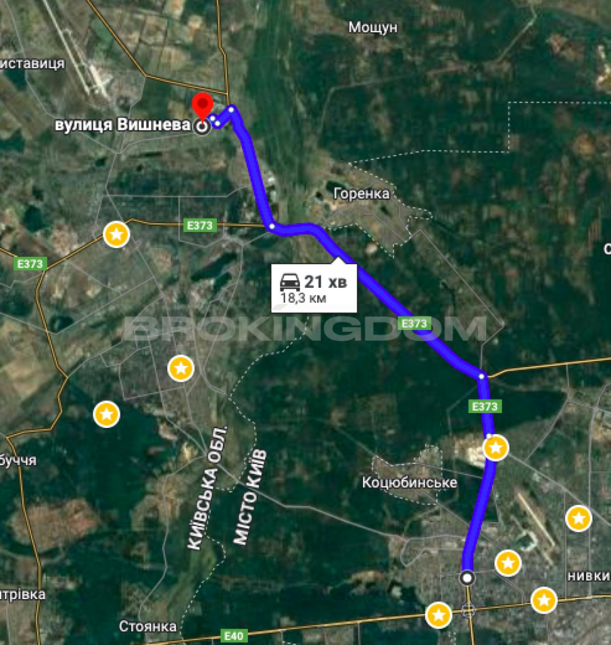 Відстань до траси Е 40 у напрямку м.Житомир 22 км.