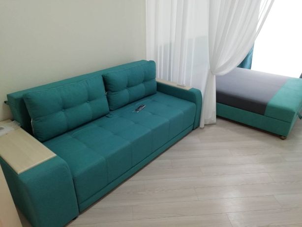 Современная дорогая мебель: в коридоре шкаф-купе в спальне диван и двуспальная кровать, встроенная кухня.