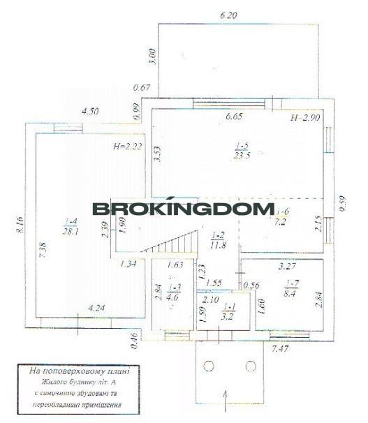 Перший поверх: Зал кухня 42м2, 1 спальня 9м2, Майстерня/котельня/літня кухня 28м2, сан вузол душова 5м2.