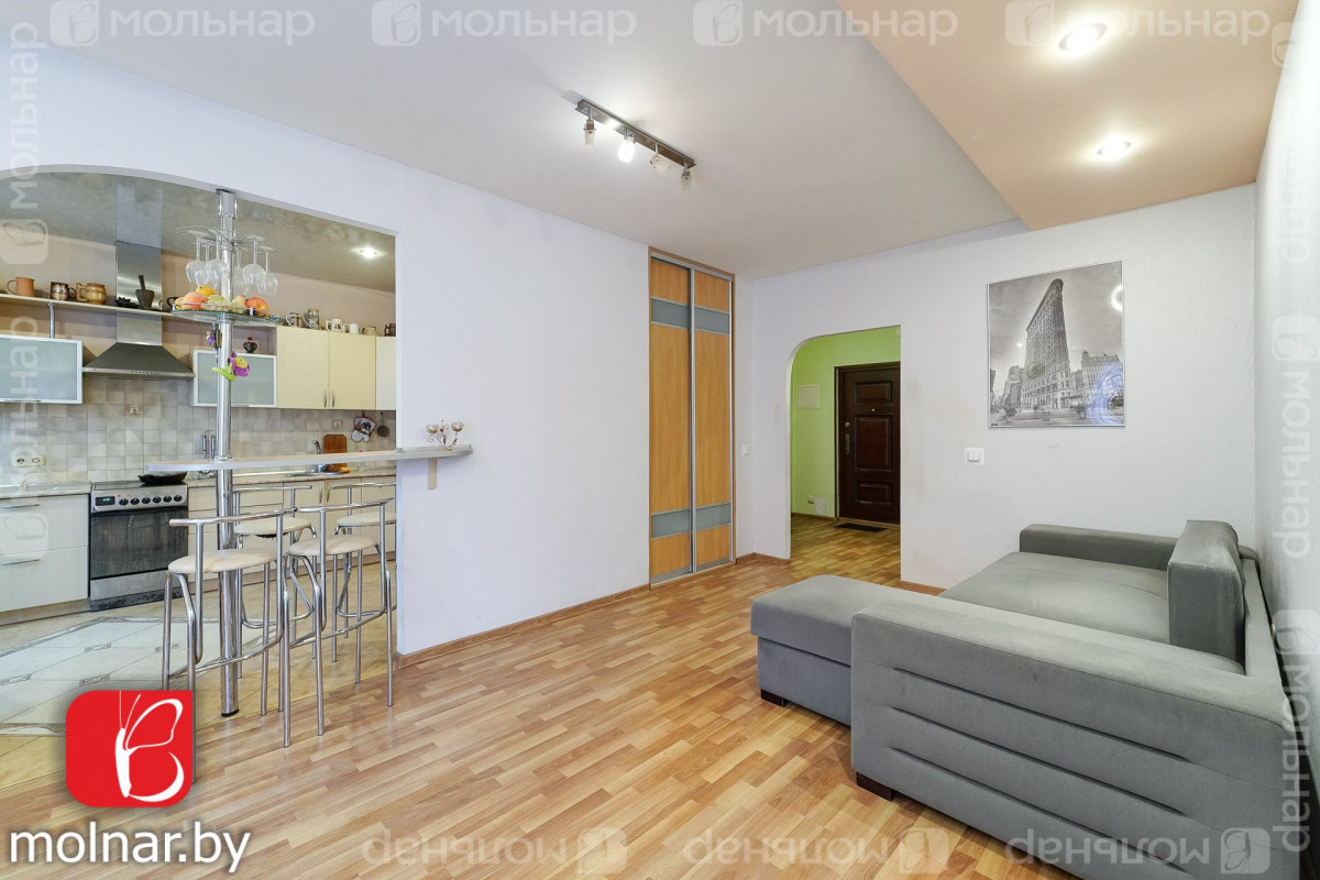 Общая площадь по СНБ — 49,1 м2, жилое пространство — 18,8 м2, балкон — 2,5 м2, высота потолков — 2,76 м. В квартире сделан ремонт: разведены электропроводка и сантехника, на полу — ламинат, в санузле и на кухне плитка. Стены выровнены и оклеены обоями. Балкон застеклен панорамными окнами, создавая уютное пространство для отдыха или работы. В квартире есть просторная гардеробная и шкаф для верхней одежды. Теплая и светлая атмосфера делают это жилье идеальным для комфортного проживания.