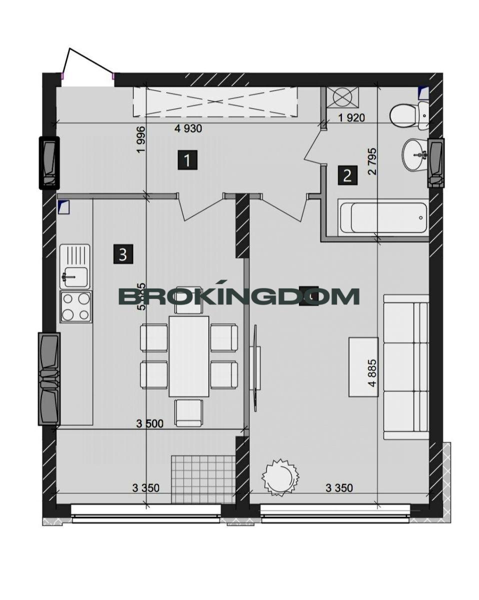 Просторе продумане планування, загальна площа 52 кв.м: кухня студія та спальня, сумісний великий санвузол. В квартирі дві мокрі точки, що дозволить за бажання внести свої корективи у планування.