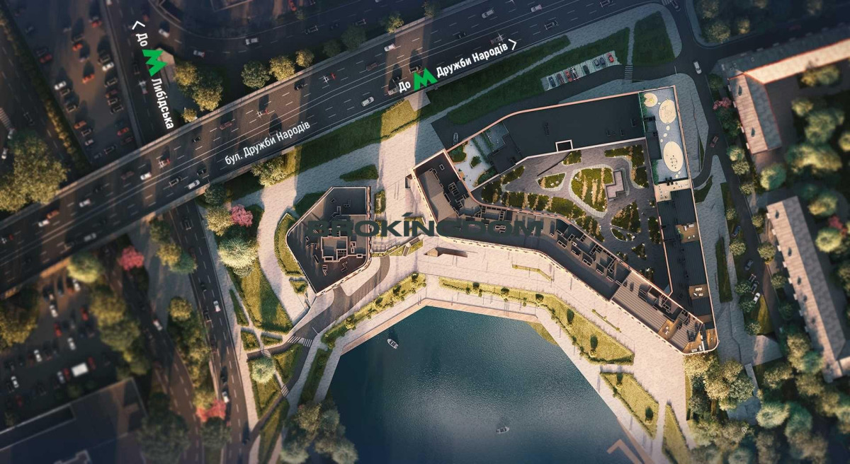 На території планується дитячий майданчик, вихід на озеро, підземна парковка (в першому та другому будинках), гостьовий паркінг.