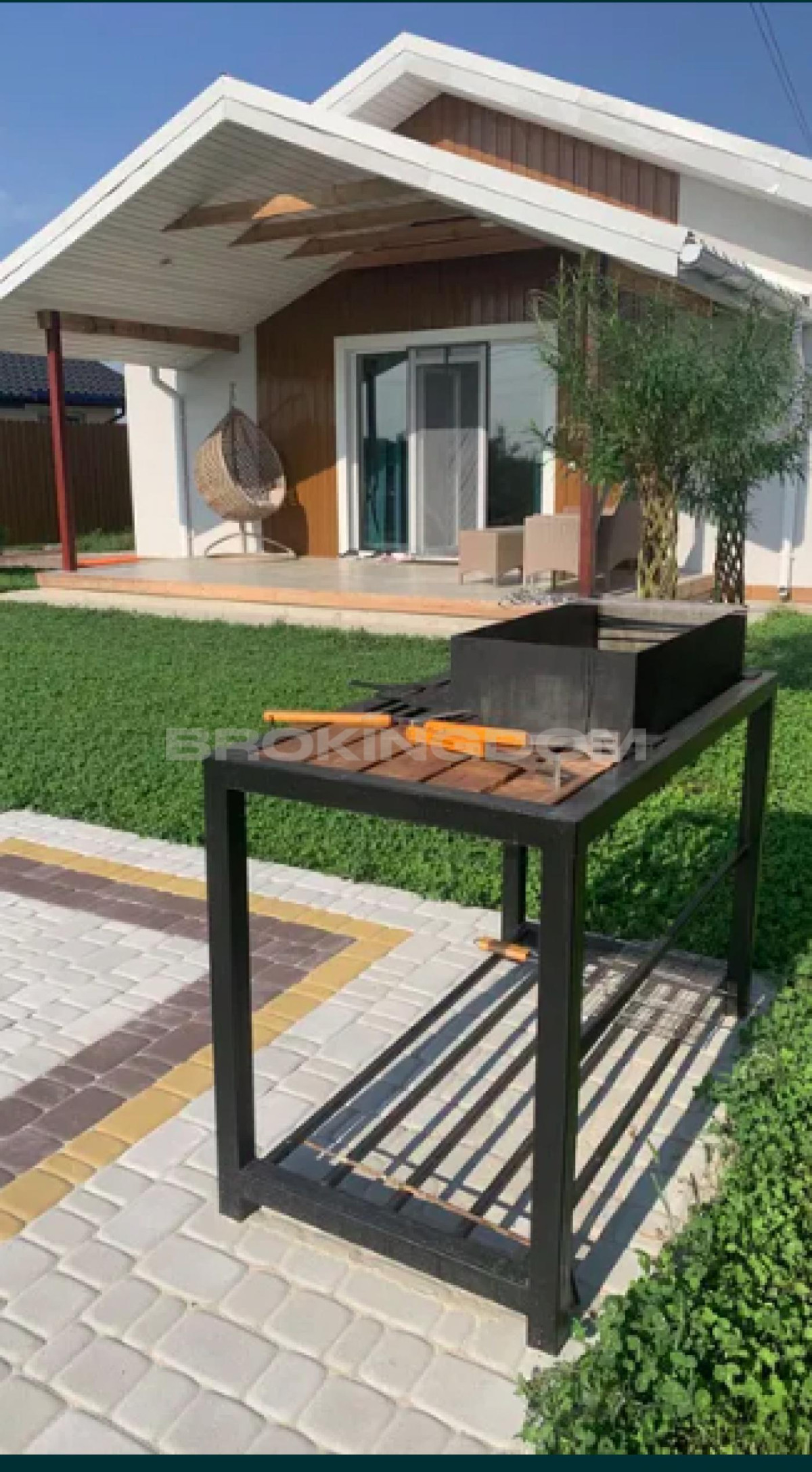 Обладнана зона барбекю, мангал. Також місце під шезлонги або басейн або літній намет з москітною сіткою. Є окремий невеликий госп. блок для садового інвентарю, велосипедів, газонокосарки.