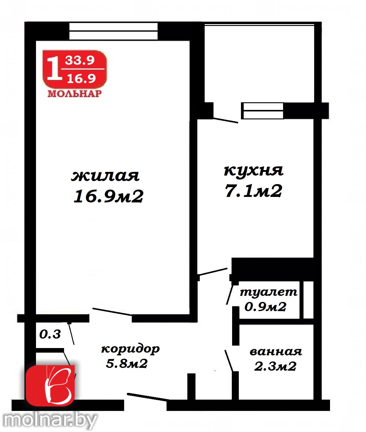 Площадь: общая квартиры 33.9 м кв, комната 16.9 м кв, кухня 7.1 м кв, сан узел раздельный.