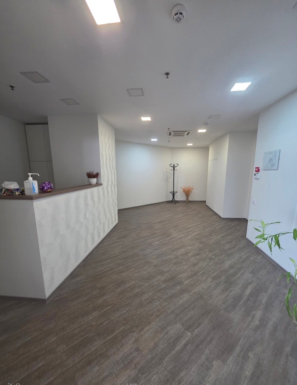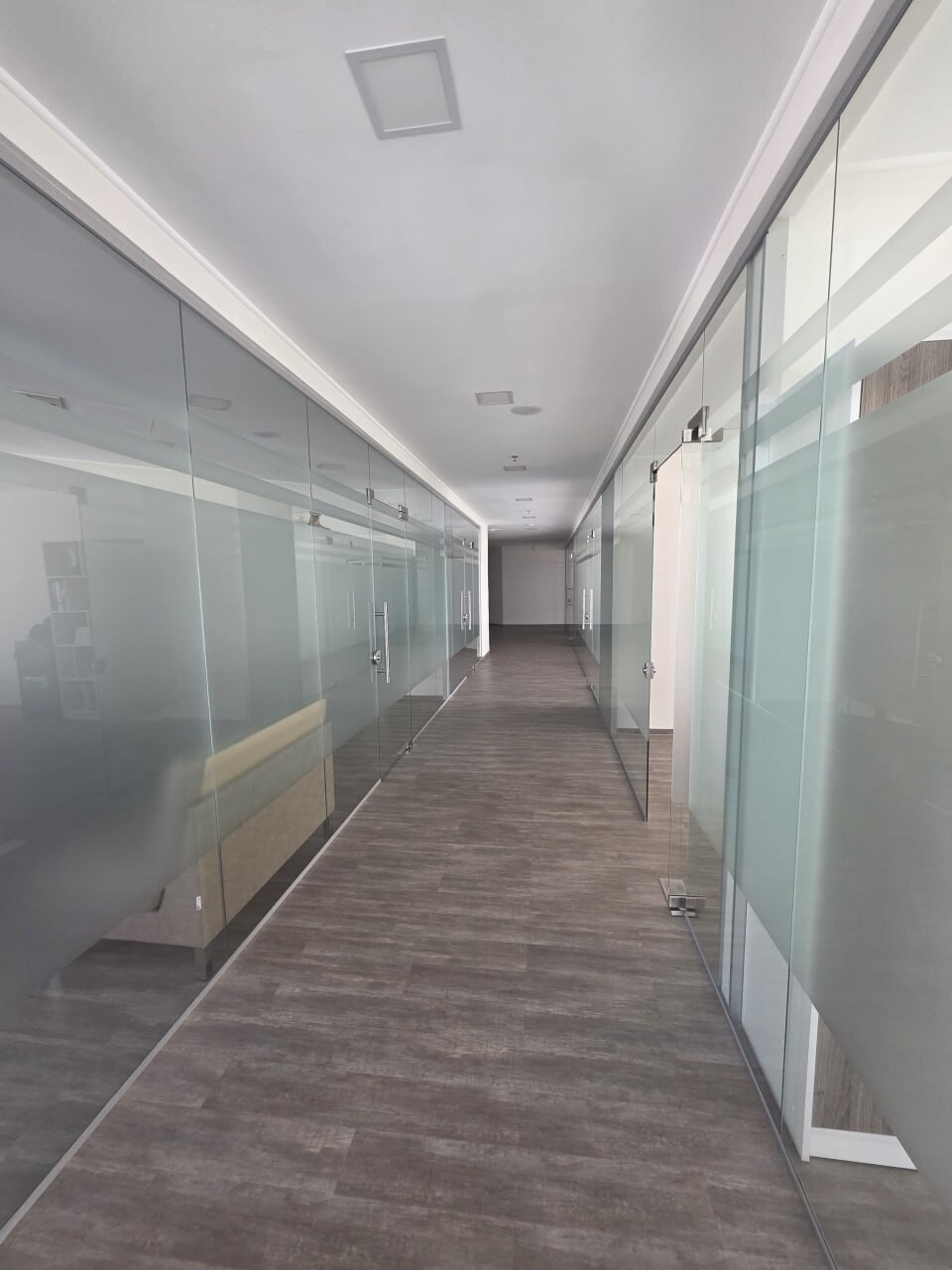 В офісі зроблений сучасний ремонт, скляні та гіпсокартонні перегородки.