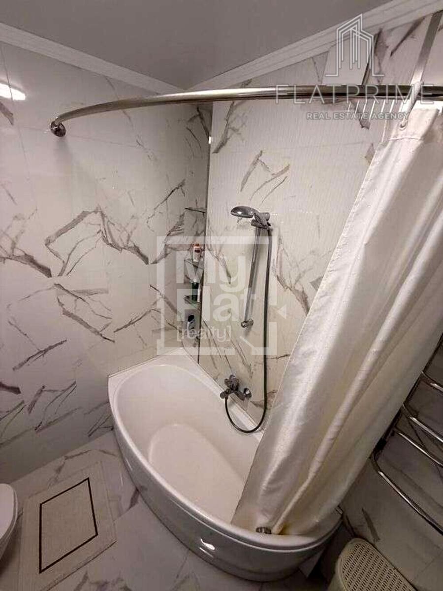 Підлога та стіни оздоблені мармуроподібним керамогранітом у стилі загальної зони.