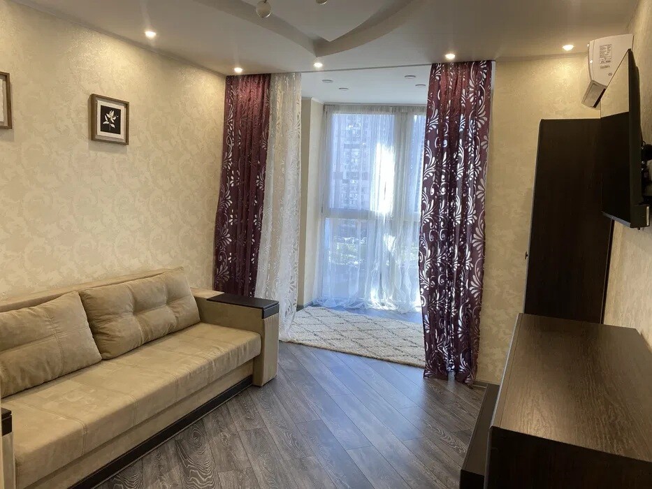 Квартира світла, простора, з панорамними вікнами. Площа: 54 кв м. 22поверх, вул. Драгоманова 2-А. В наявності розкладний диван, кондиціонер, телевізори, ліжко, столи зі стульями, пральна машина, бойле...