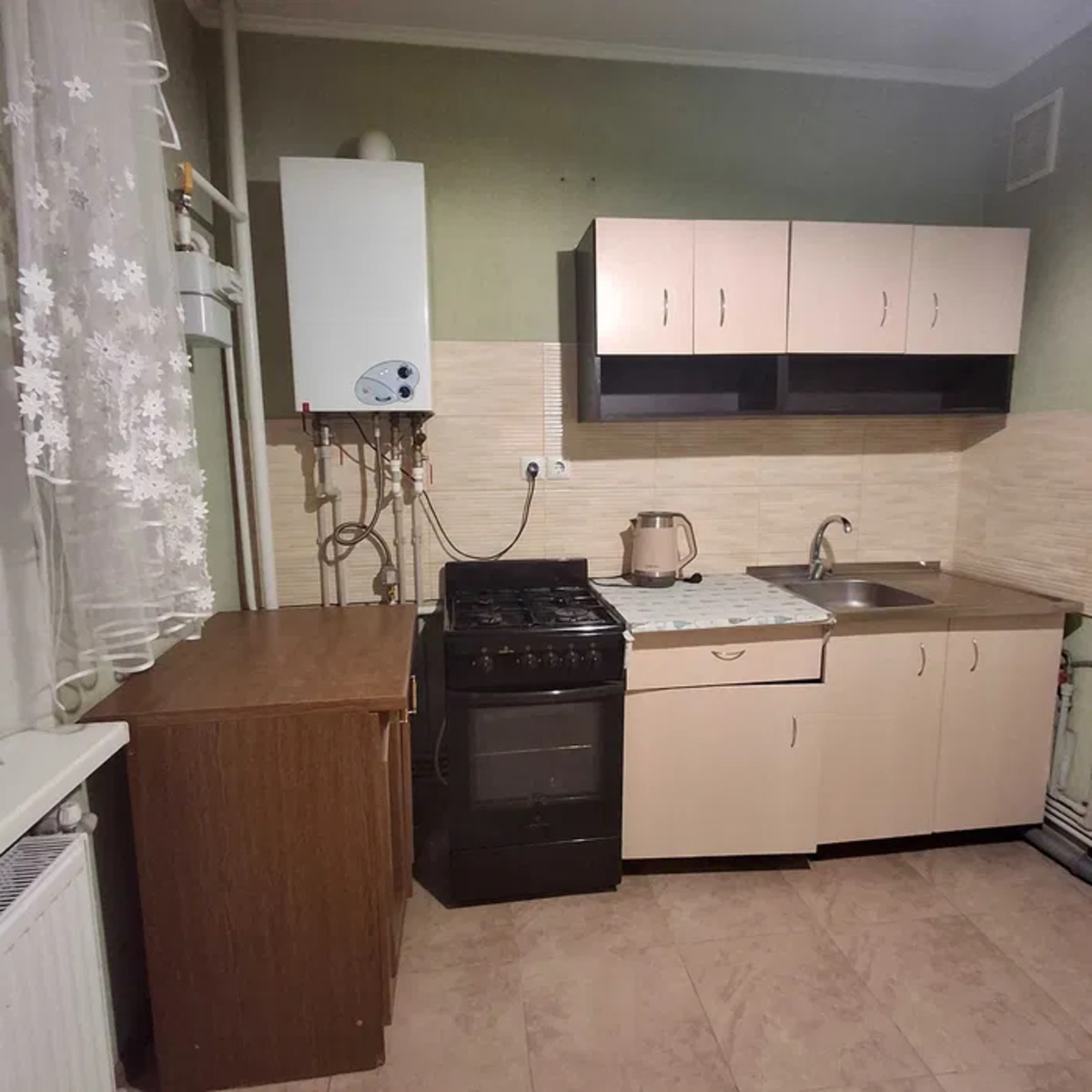 Cанвузол: Суміжний;Опалення: Індивідуальне газове;Побутова техніка: Електрочайник, Холодильник, Варильна панель, Праска, Мікрохвильова піч, Духова шафа, Плита, Пральна машина;