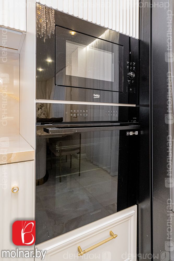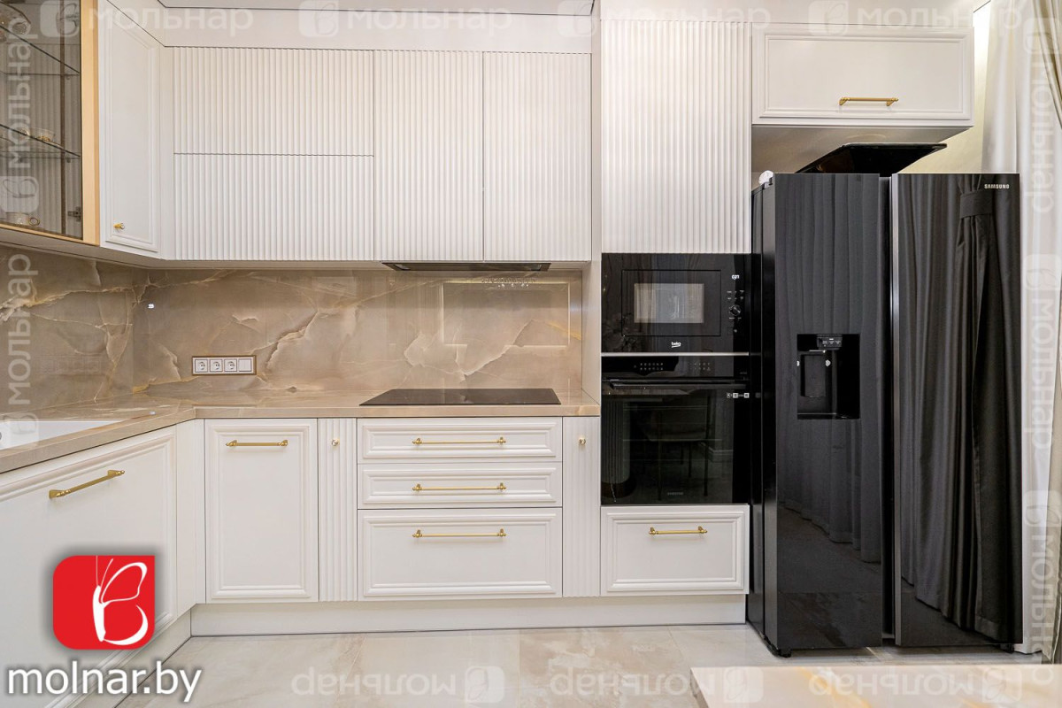 • Современная кухня с всей необходимой техникой (холодильник, посудомоечная машина, духовой шкаф) и функциональными шкафами, готовая к использованию.