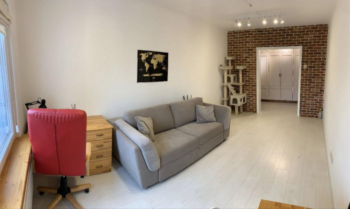 - вітальня: тут є великий розкладний диван, два робочих столи з дерева, зручне офісне крісло.