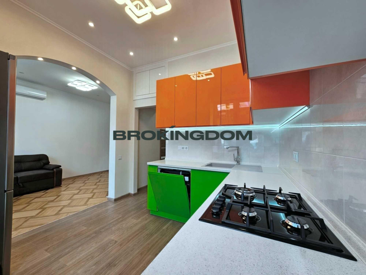Будинок цегляний, «сталінка». Поверх 2/5, висота стелі 3 м., під’їзд охайний. кодовий замок. Загальна площа квартири 70 м.кв., кімнати роздільні. Квартира утеплена, новий ремонт із заміною всіх комунікацій, якісні матеріали, натуральний паркет, броньована вхідна дверь. Квартира мебльована та обладнана всією необхідгою технікою - посудомийна та пральна машини, варильна панель, духова шафа, витяжка, двокамерний холодильник, бойлер, три кондиціонери